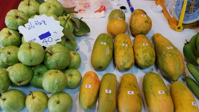 。有个番友要求我给他三月份出行泰国给点建议,我已经单独回复了他。还有番友建议多谈点物价的问题,这个问题也是我所关心的问题。这个问题,你如果是跟着团队在泰国好吃好喝玩了几天,回答起来肯定是片面的。而我,因为有心关注,在曼谷,关注了渡轮中心码头的那个BTS高架桥下的集贸市场,在清迈关注了瓦洛洛集贸市场和老城北门那个凤飞飞猪脚饭后面的农贸市场,我当然算是了解的比较透彻了。泰国的市场物价绝对不比中国便宜。顶多也只能说是差不多。蔬菜品种少得可怜。肉类海鲜类品种也并不多。远远的不能与我们国内的农贸市场和超市相比。很奇怪,他们不管是哪个市场都不会把商品码放得整整齐齐,都是乱七八糟的。你如果在国内家里是个当家的,到了他们的市场,就会连点购买欲都没有了,特别是蔬菜及肉类。说点具体的吧:各市场青菜都在20-30铢每斤,相当于我们4-6元。猪肉腿肉,五花肉的80-100铢,等于我们16-20元。木瓜很多,30铢一个约近一斤重,他们的木瓜很好吃。菠萝30铢一个二斤多点吧,我们国内菠萝2元到3元1斤,一个菠萝也就两斤来重吧?所以是差不多。柚子每个99铢,可能有三斤重,这个比国内贵,国内白柚2元一斤红柚3元一斤,折算远低于99铢。在清迈的市场看到地瓜(番薯)特别的贵,79泰铢一公斤,国内每斤才2元左右。螃蟹每公斤300泰铢,每只约重三-四两的。这个比国内许多超市便宜,与我们沿海市场差不多。大虾300铢一公斤,也比国内便宜。图