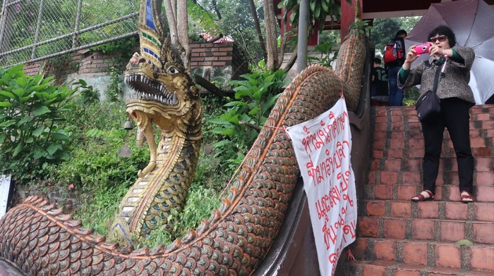 租了摩托车上素贴山的,计划是游览双龙寺,蒲皇宫,回来再逛清迈大学和宁曼路清迈的新城。用百度地度导航上山,结果是那天下雨,云层厚gps信号差,百度定位误差超过500米。导航指示我向左向右全都不对,绕来绕去怎么也走不到上山的路。在清迈大学后门那条大路绕了半天,停下问路双龙寺没人听得懂。终于看到有几个年轻姑娘在那个大门边等双条车,我想素贴山的方向就是清迈大学那个方向,于是凑过去问清迈大学在哪里。