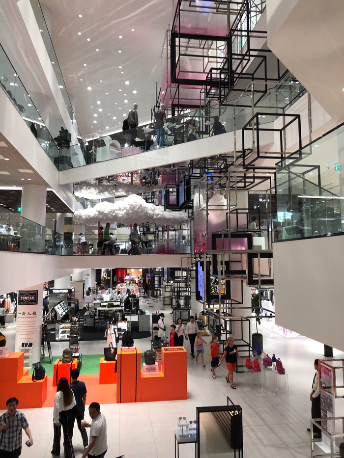 整个购物中心以机场航站楼为概念,从地下层算起,每一层的装饰风格分别是加勒比海岸、罗马、巴黎、东京、伦敦、伊斯坦布尔、三藩市及唐人街,不光是每一层的商场有各个城市特色,包括每层的厕所都设计的非常好看,可谓别具特色。让人印象深刻。一楼是一些国际2线品牌,二楼比较多的是些个体商铺,还有一些 泰国 本地设计品牌店。