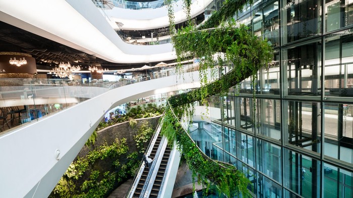 EmQuartier 的户外花园则是众多商场中的佼佼者,它给炎热夏日里的一抹惊艳。顺着电梯进入户外花园层,仿佛置身于巨大的热带植物园中,满眼都是葱翠的绿色和潺潺的水声,完全忘记了自己是身处在市中心的繁华大商场中。所有的炎热都被阻拦在玻璃幕墙之外,剩下的只有与自然的亲近之感。