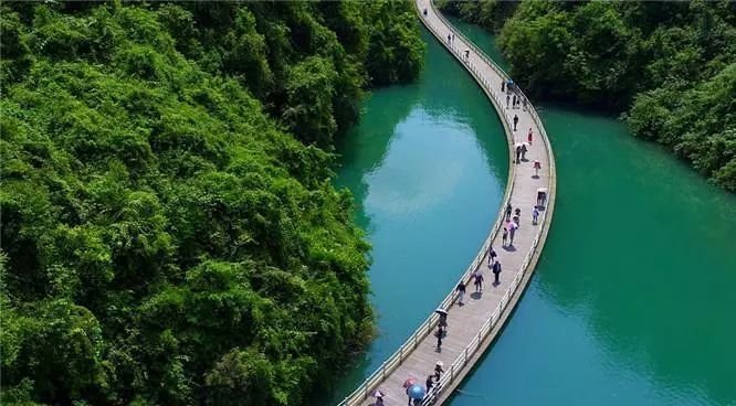 行走至浮桥上,两岸层峦叠翠,让人心旷神怡,驾车行驶在浮桥之上,一路水波涟漪,起伏跌宕,美不胜收。