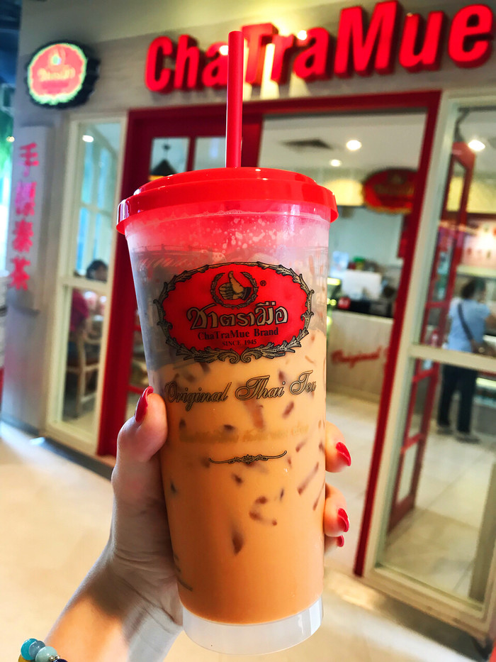 有别于一般的奶茶,泰式奶茶是橙色的,这可不是色素造成的,而是红茶粉煮出来的颜色。红茶加上炼乳和冰糖,最后再丢入几粒冰块,就是清爽又香甜的泰式奶茶了。