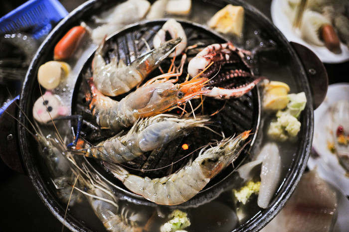 泰式自助火锅“Mugata”,存在于泰国几乎所有城市,最有名的要数清迈的“千人火锅”。煤气炉点燃后,架上一口类似帽子的锅,中间鼓起来的部分用来烤肉,而四周的“帽檐”则加上水用来涮蔬菜和豆制品。最受欢迎的菜品是大头虾,一般上来就被抢完。