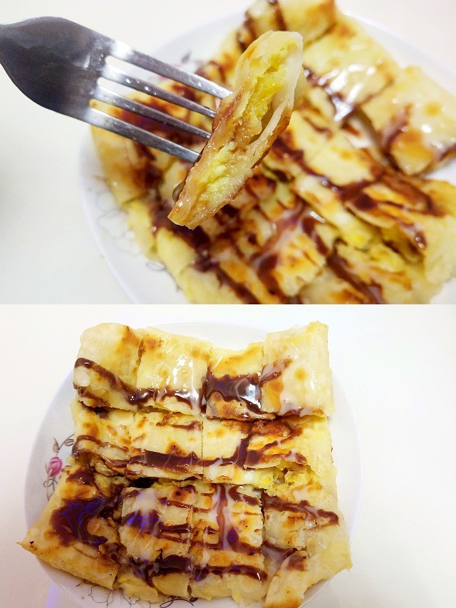 香蕉煎饼是泰国街头巷尾都可以看到的小吃。香蕉煎饼的做法和中国的煎饼果子很类似,在圆形平板锅上摊上一层薄薄的面糊,在面糊中央放上鸡蛋和切片的新鲜香蕉,然后将面糊折叠成方块,最后淋上巧克力酱、炼乳等。