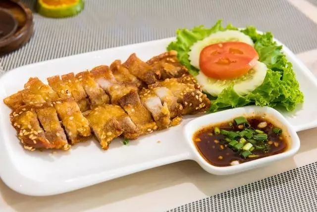 碳烧猪颈肉这道菜绝对是泰国本土传统菜式了,是很多人吃泰餐时喜欢点的,这道菜的关键是要取用猪颈肉来碳烤,烤出来的肉才会脆香。蘸酱也非常重要,用泰国朝天椒、香菜末、香葱末、蒜末、白砂糖、鱼露和青柠檬汁混合制成。