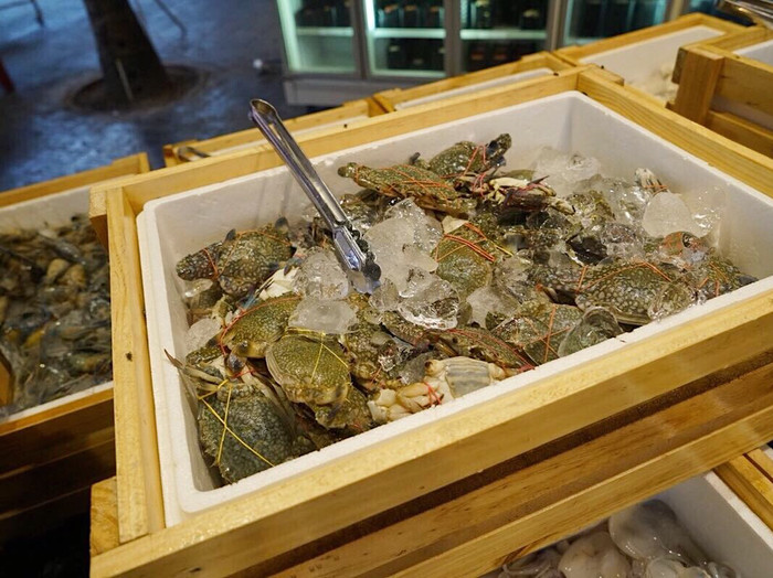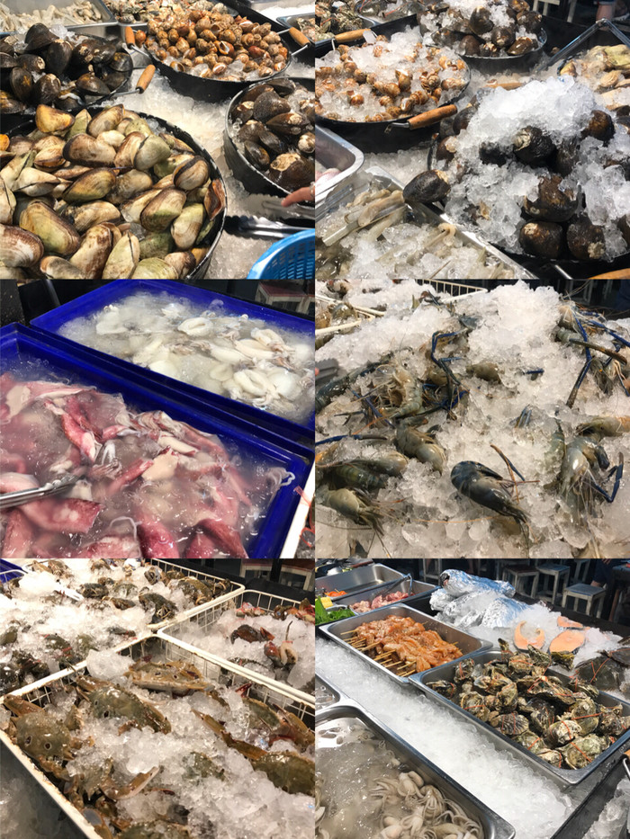 餐厅有大量海鲜,包括虾、蟹、鱿鱼、贝壳类等,螃蟹和虾有活的和冰冻的,活的虾在一个鱼缸养著,可以自行挑活虾再拿去烧烤(活的抓起来以后记得先放进旁边的冰桶里面泡一下,不然会到处跑)