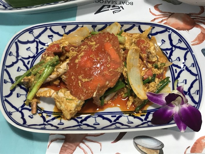 咖喱炒蟹是极受欢迎的泰国名菜,切块的红蟹加上配菜与咖喱和各式香料共炒,突出蟹肉的鲜味与弹性。咖喱味香浓滑口,蟹肉爽口清甜,咖喱汁捞饭更是美不可言。