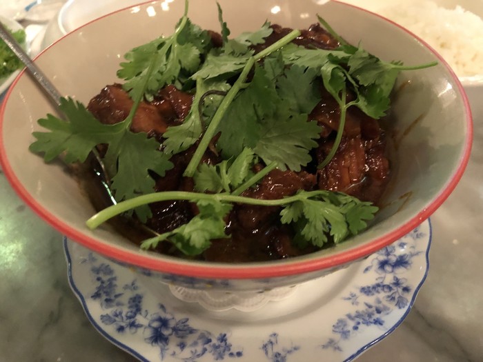 菜品的性价比很高,菜品大都是从几十铢到一二百泰铢,非常划算。推荐他家的香酥炸豆腐,豆腐炸得外酥里嫩,再佐以肉末、辣椒末、黑胡椒等香料,好吃到哭,瞬间就被我们秒杀。白灼蔬菜配虾酱也不错,虾干口感偏脆,蔬菜非常可口。餐厅离Lard Yai周日市场很近,恰逢我们也是周日去用餐的,顺便还去逛了一下集市,可以说是完美的一天了。