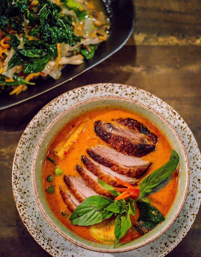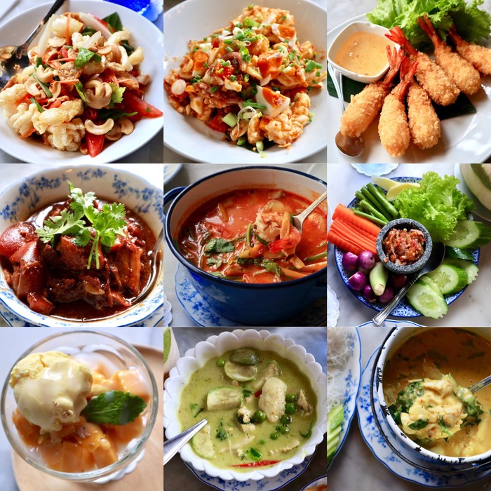 推荐菜品:香酥炸豆腐、泰式红烧肉、咖喱蟹、碳烤猪颈肉、白灼蔬菜配虾酱、鱼露生虾、覆盆子冰沙。