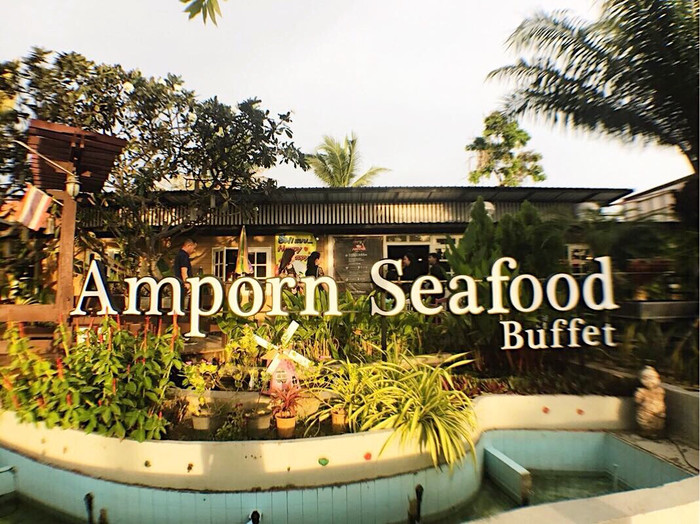 场地很大,绿化好,厕所算干净,门口处有个小水景,室内室外都有桌子,建议大家坐室外露天的位置,虽然坐室内方便拿东西,但是烧烤坐室内太闷,而且晚上室外露天配着灯光更有情调!拿餐的地方在室内:分为沙拉区、热菜区、海鲜区(有一辆写着Amporn Seafood的车)、冷柜、饮料区。