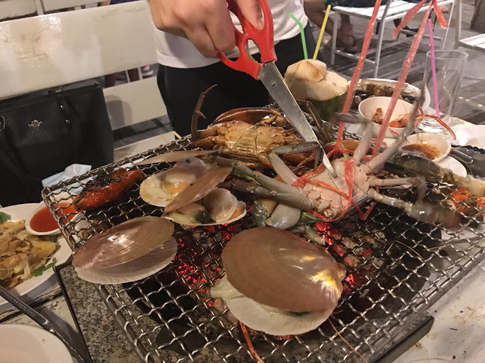 这是一间靠海的大排档 那一条街都有很多海鲜大排档 但这家门口就有一个大螃蟹 而且店面非常大 几乎满客 虽然说是大排档 但是看起来很干净 不像国内的大排档会看起来脏兮兮的。