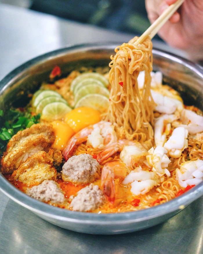 mama泡面mama是泰国知名的泡面品牌,而且这家店的老板确实是一位和蔼可亲的阿姨,所以名字蛮贴切的~mama泡面是隐藏菜单,要10点半之后才能吃到,所以这也是为什么深夜还有那么多人排队的原因!因为这家店主打新鲜食材,所以营业到尾声,食材还没有用完,就直接放泡面里了,很典型的泰式风格,食材也多,吃起来超过瘾!