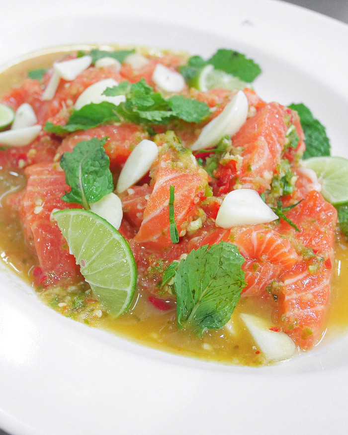 这道菜基本是每桌必点!味道也没让我失望,不愧是招牌菜之一。肥嫩多汁的新鲜三文鱼,加入特制的泰式酱汁,酸甜可口,余味比较辣。吃的时候裹上蒜瓣,完全不会有饱腹感