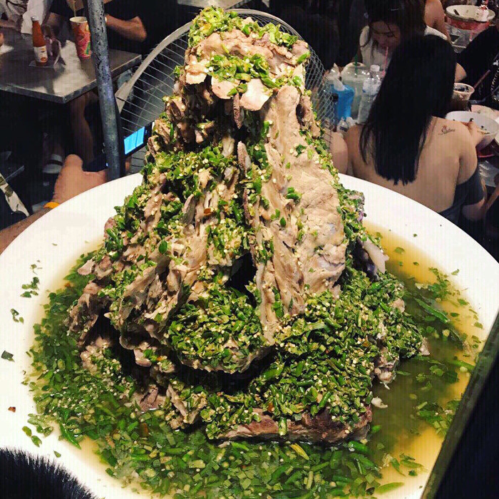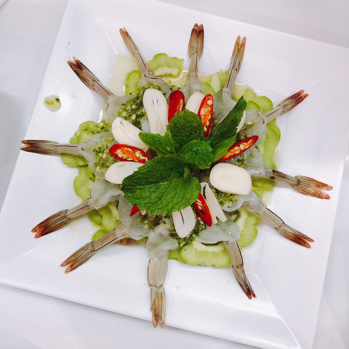 不像日式虾的甜,也不像潮汕生虾简单清爽的鲜,这道泰式生虾味道很有层次:上面铺着泰国辣椒、大蒜还有泰式海鲜酱汁,底下铺着一层腌制过的生苦瓜。辣、鲜甜爽口,一个人吃完一盘,是抑制。