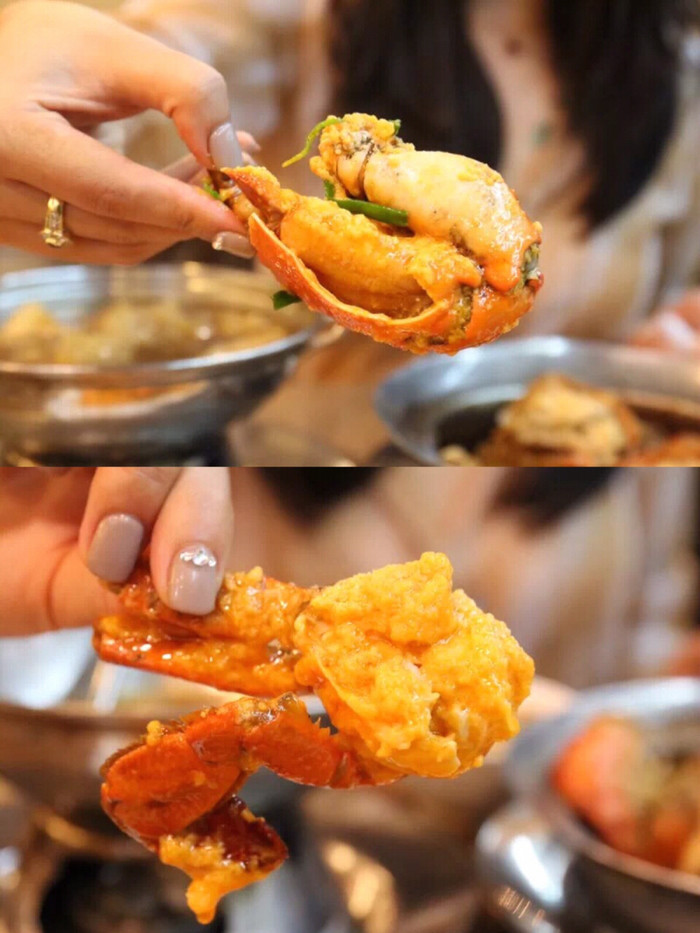 咖喱蟹,哇塞咖喱蟹真的无敌入味 而且肉很实,已经情不自禁的直接拿手了。看看那个蟹肉很大块的呢,炒鸡满足。