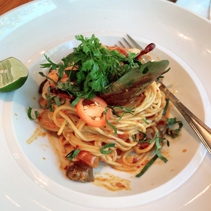 喜欢吃海鲜的人 也会喜欢这里的冬阴功火锅大虾,青口鱿鱼~ 各种螺和菌菇都很新鲜汤底是越煮越好喝哦,我们连喝了好几碗不输那些正宗的大排档 酸中带甜很开胃,还有咖喱蟹、空心菜、小炒们也不错。