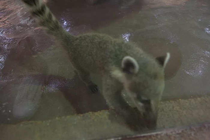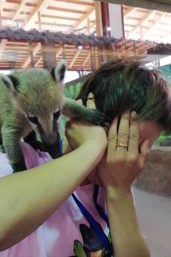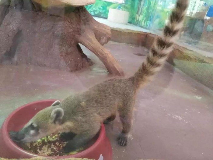 最受欢迎的萌宠就是它 —— 宠物明星,多多!它是一只长鼻浣熊,它们的脸部非常有特点,因为他们有着长长的尖鼻口,并且带环纹的尾巴还是竖立的~当它表演空中悬挂时,大家都觉得非常惊奇,讲解员告诉我们说这是它的绝技,非常受欢迎。