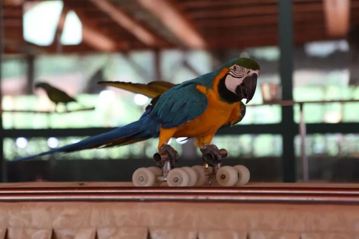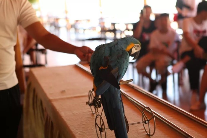大家都知道,鸟类其实是很聪明的,尤其是鹦鹉类的,萌宠乐园里的鹦鹉们经过训练掌握了特别的表演才能,有些鹦鹉会说话,有些会做各种特技,这时,一只鹦鹉推着一辆小自行车上台了,只见它放下慢脚步小心翼翼地爬上了自行车,可是自行车不听它的使唤故意和它作对,时而向左,时而向右,可它一点也不害怕,用双翅紧紧的握住龙头,观众们连连拍手叫好。