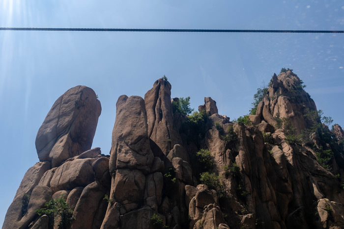 从缆车方向远观群山,参差不齐的山头上遍布着神态各异、姿态万千的石头,下过雨的山,白云弥漫,显得格外清秀盎然。