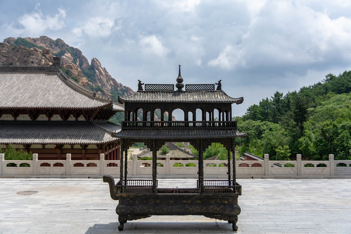 寺门前的大钟给这座古寺增添了一点神秘肃穆。走进寺庙,就可以看见青麻石的底座,四周有汉白玉组成的栏杆,那映在绿树丛中的寺院,朱红色的院墙,青灰色的屋脊,苍绿色的古木,庄重悠远。彷佛透过历史长河,看到了这座寺庙当年的富丽堂皇。