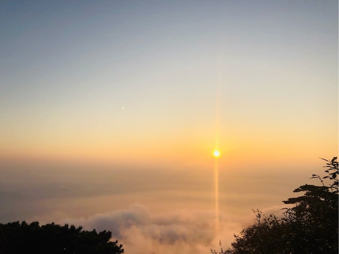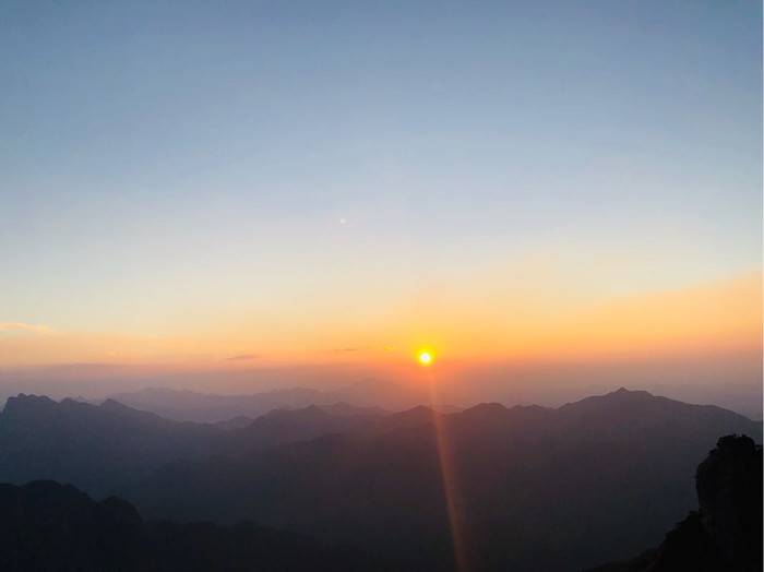 看日落选择在观音送子的玻璃栈道上看。特别美。到了日上山庄已经天黑了,在宾馆里吃饭真的贵,两菜一汤175元,不能饿了肚子吧,饭吃好,开始服务员,他们已经在宾馆门口搭好了帐篷,洗澡厕所都在三楼,公共的那种,9点后面没有热水。看了看帐篷还可以,热乎乎的,加被子是要钱的,只有一个被子。晚上肯定睡不着,看了看月亮星星,打算早上去看日出。
