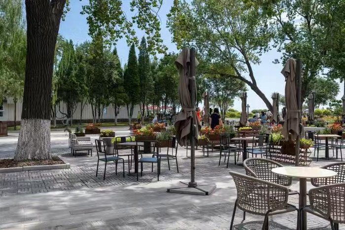 临近海边,散落着可供游客休息的桌椅,搭配同款深咖色系的遮阳伞,此时就该配上一杯浓郁的卡布基诺,衬托浓浓的意式风情。