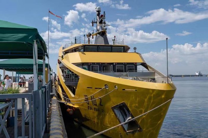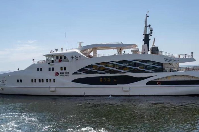 据说寻仙号系列游船,是根据秦始皇探海寻仙的典故设计的,每一艘游船都各有不同,独具特色。寻仙一号的整体呈白色,像是波动的海浪,呈流畅的线型,更具柔美气息;而寻仙二号则棱角分明,浑身是刚毅的线条,黄黑色的颜色搭配,更加霸道,更有气势,仿佛一位武装的斗士,永远保持士气高昂。