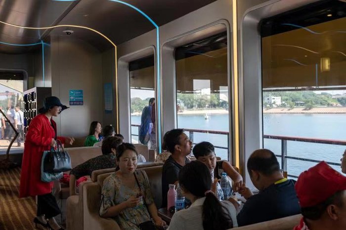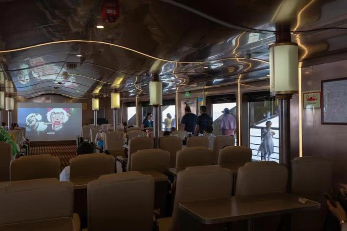 二层的客舱十分舒适,四周皆是落地窗,在室内就能轻松看到海,还能够抵挡绝大部分的紫外线。客舱内,头顶波浪形吊顶,镶嵌着Led灯,脚踩全覆盖的地毯,卡座设计像是咖啡厅一样,整体风格和谐统一,简约舒适。坐在其中,能卸掉生活的烦恼……