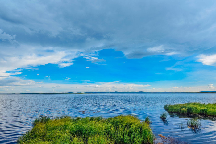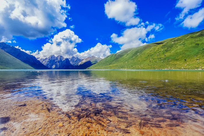 她时而碧波荡漾、涟漪绰约,时而波平如镜,宛如娴静温柔的少女。湛蓝清澈的湖泊把巍峨的山峰、蓝天、白 云和 群群牛羊,倒映在水中,恰如一幅美丽的田园画卷