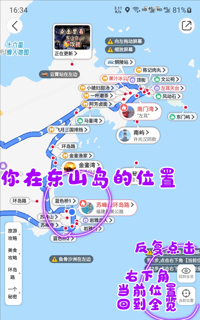 第2步:点击右下角“当前位置”,显示你在“漳州、东山岛”的位置。
