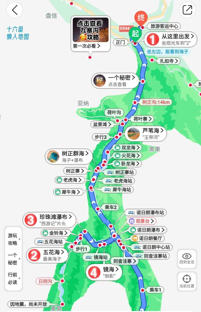 4、切记!点击『当前位置』,在九寨沟跟随路线游玩。