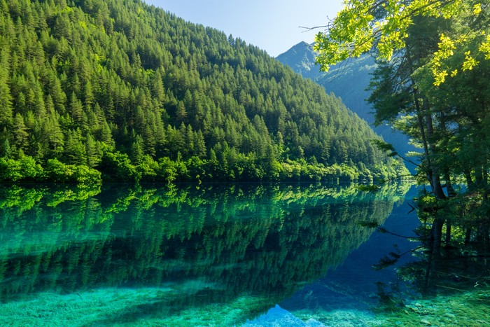 镜海位于树正沟和日则沟的交界处,海拔2390M,是九寨沟著名景点之一。它就像一面镜子,将地上和空中的景物毫不失真地复制到了水面。当晨曦初露,朝霞染红东方天际之时,海水一平如镜,蓝天、白云、雪山悉数被映放在海面,呈现出"鱼在云中游,鸟在水中飞"的奇观。