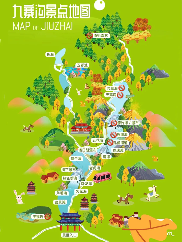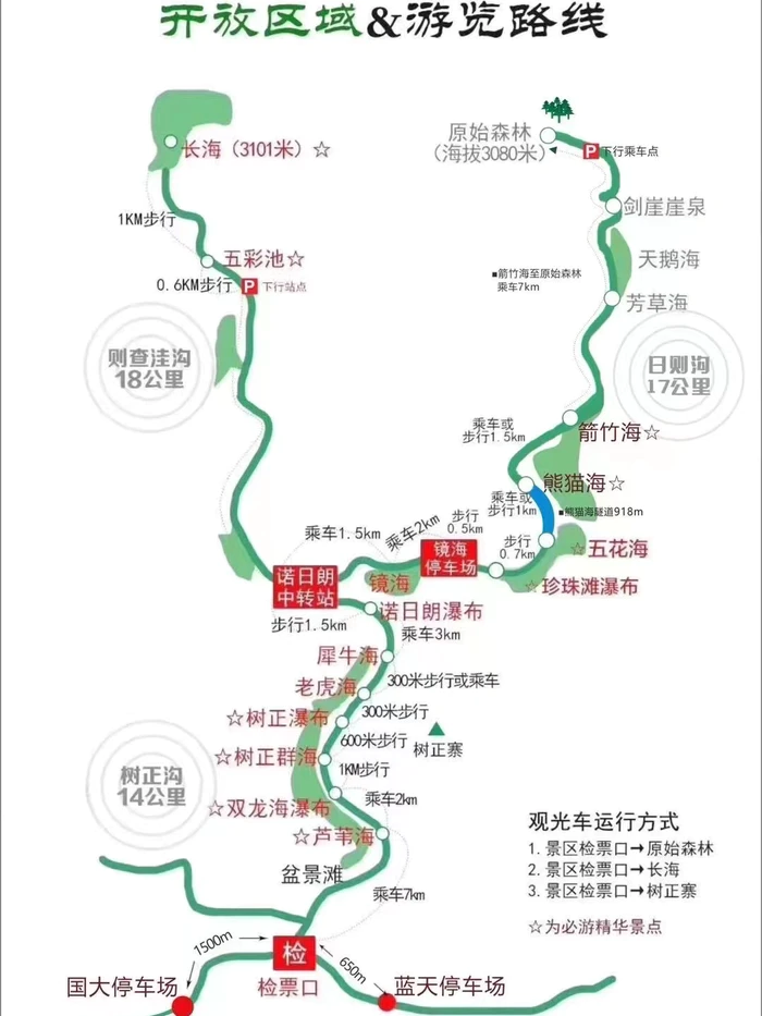游客中心→原始森林→芳草海→天鹅湖→箭竹海→熊猫海→珍珠滩→五花海→诺日朗中心站→诺日朗瀑布→犀牛海→树正瀑布→树正群海→双龙海→芦苇海→盆景滩