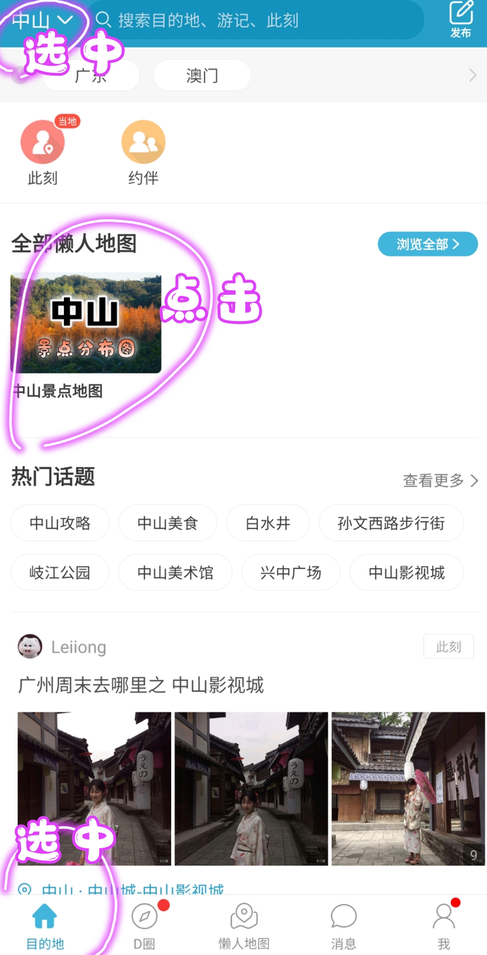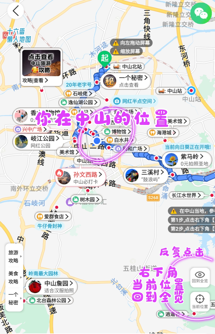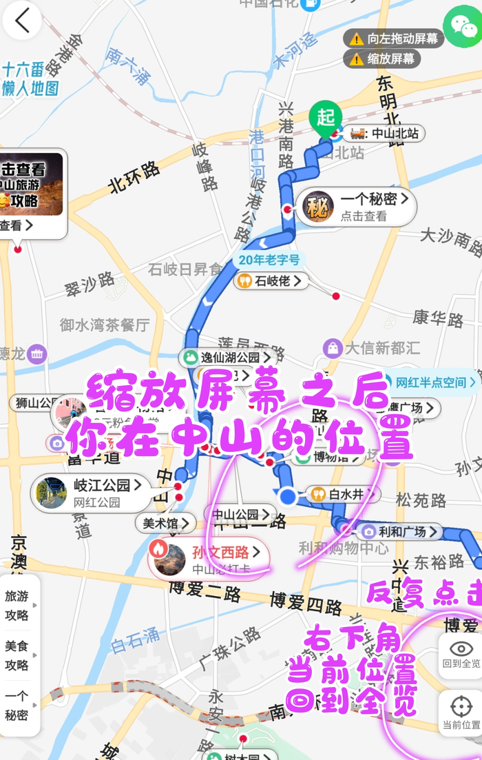 第2步:点击右下角“当前位置”,显示你在中山的位置。