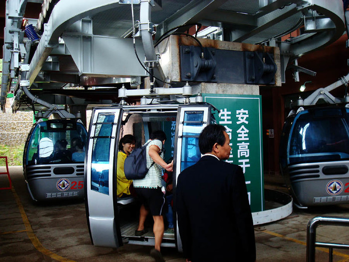 金顶索道,在接引殿附近,现场有2种不同的索道可自选乘坐,一种是往复式大缆车(每车50人),另一种是循环式小缆车(每车6人),图片见十六番懒人地图。