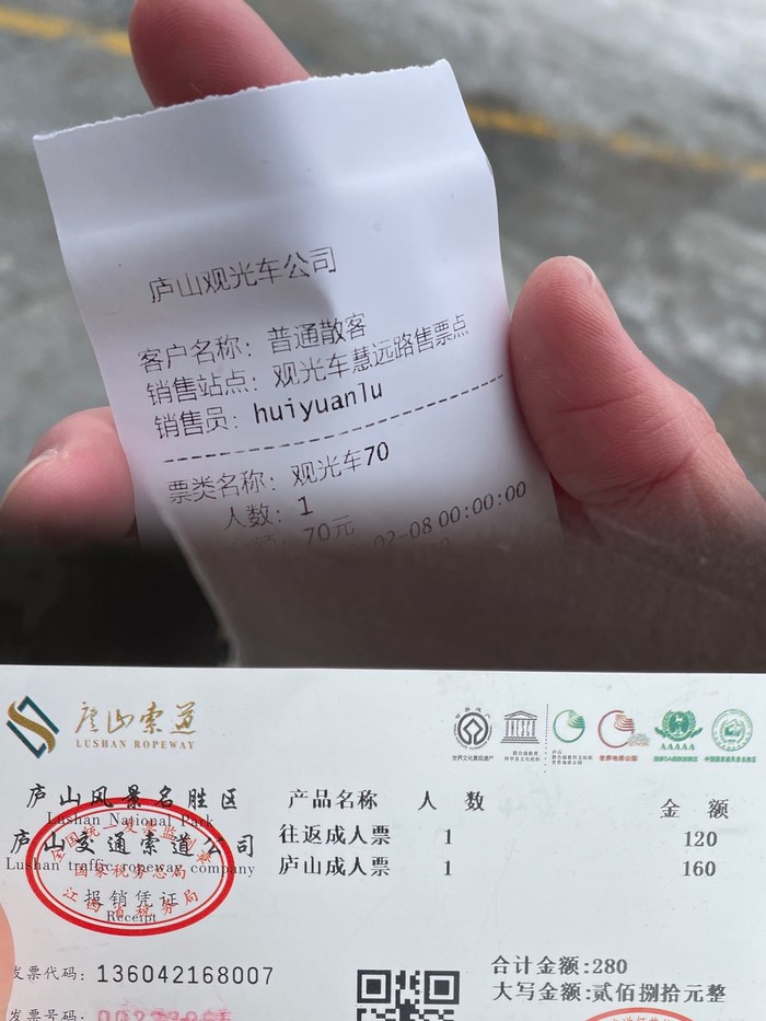 6. 物价相关(2.7号非春节假期去的,可参考,但是春节假期肯定有所出入):冬季本来是淡季,但是下雪了肯定会有所上涨,酒店要是有看到便宜的评价好的一定要提前订,雪季涨价很快,也会很快没房。不过庐山的物价真的不高,这次我们住的酒店100多,但是有电热毯空调,在街心公园对面,性价比极高,而且我查了下,100多的酒店也挺多的,性价比酒店很多。两人一顿饭点评买套餐70-90左右能吃的很好,很良心的物价,我们吃了好几家没踩雷的,比小红书推荐的都好吃,奶茶小吃啥的也不贵。早餐10元左右每人能搞定