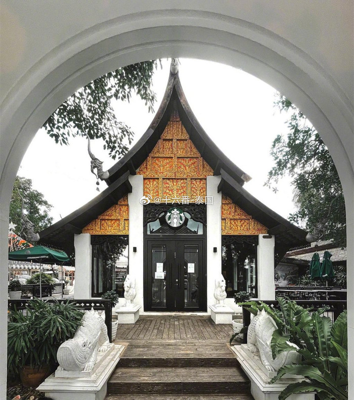 世界上唯一一个以泰国兰纳主题风格设计的星巴克咖啡店,柚木的房梁、精致雕花的墙柱、金碧辉煌的壁画及装饰品,感觉就像是在皇家喝咖啡一般。
