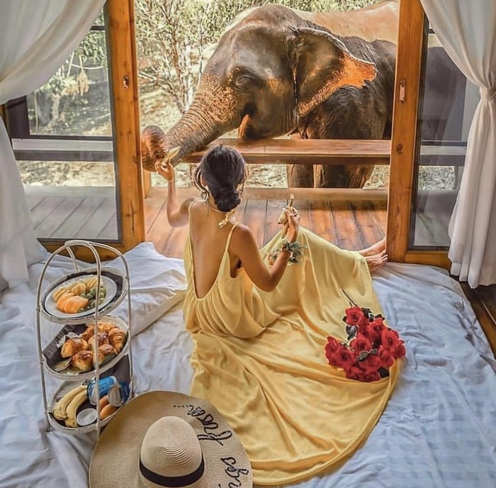 这家网红民宿是一家具有公益性质的生态民宿,因为这里倡导与大象一起生活的理念,而受到超多欧美旅行者的追捧,特别是大象 Morning Call 的服务,让这成了 ins 网红的打卡地。如果你要冲着体验大象叫早服务来这,建议预定 Modern Balcony Cabin 房型或 Modern Bungalow 房型。目前来看,这两个房型最适合体验大象叫早服务,大开间的落地玻璃门是这两个房间的共同特点,适合与大象互动,拍照也是美美的!这里没有大象表演,更不会虐待大象,你可以协助主人照顾11只被救援的大象,譬如洗澡,喂养,甚至与大象一起玩等。民宿位于距离清迈有40多公里。