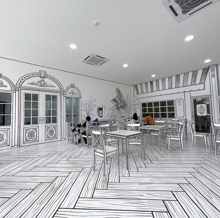 位于清迈3D博物馆内,2D咖啡馆用黑白色线条打造,照片拍出来就像黑白的平面图一样,跟3D博物馆截然相反。