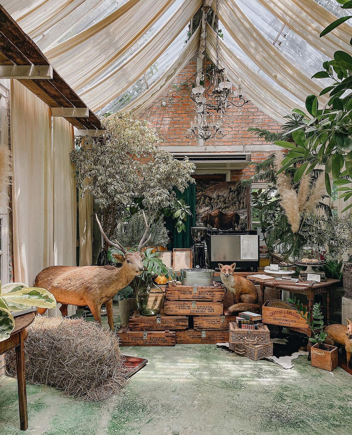 走的是欧式复古路线。一栋漂亮的玻璃小房子隐藏在茂密的绿色植物当中,门前布置着两尊欧式雕塑,周围是民房田野,环境清幽。走进店里,里面的装潢同样精致复古,吊灯,红砖墙,各类花束绿植,让这里充满了浪漫唯美的气息,有时也会有新人在此举办婚礼。除了咖啡甜品,这里也有正餐。