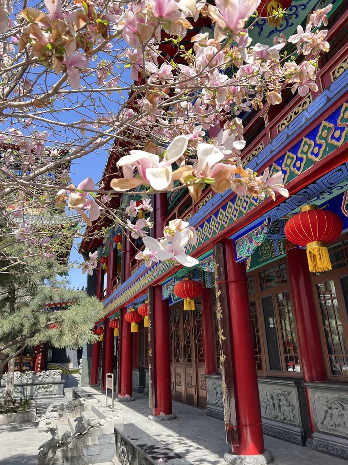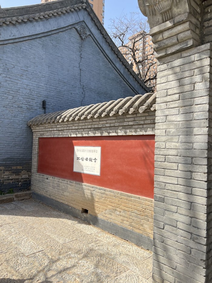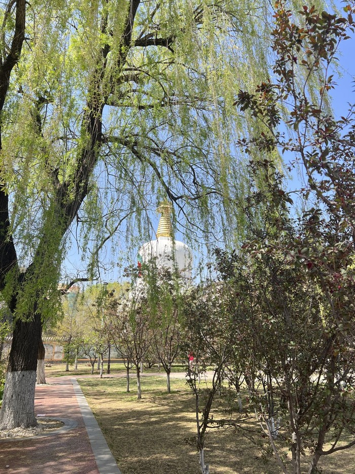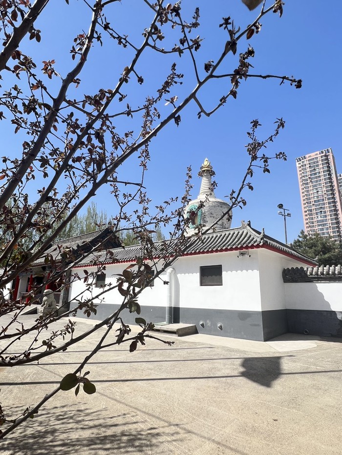 北塔 个人感觉北塔是四塔中占地面积最大,人气也最旺盛的一塔,可能与他本身处于相对热闹的皇姑区一环内有关。与北塔相邻而建的是护国法轮寺,玉兰就在法轮寺的院中,4月12日白色玉兰开的正盛,据说如果提早一周会比现在更漂亮,与之相对的是一株稍小一些的粉色玉兰,或许是因为还小,树上的花朵不是太多,也并没有完全盛开,没有白色玉兰那样受人瞩目,也少有人驻足拍照。本因玉而来,却又不善拍照,只是习惯于走马观花凑个热闹。对佛教文化不是很懂,因为在寺通往塔的院墙门边有一大群人在用彩色描绘已经破损的写有藏文的石碑,大小不一,也不知道具体应该称为什么,所以感觉法轮寺应该是藏传佛教寺。穿过门就来到北塔的脚下,有些正在塔下磕长头的人,都是女人,塔的正面有一排为磕长头专门用的石板,不知道专业的名称应该叫什么,像是大理石,好些已经被磨的光亮。塔下的其余三面被整排的转经筒围绕,这也是我认为法轮寺是藏传佛教寺的另一个原因。法轮寺的后院安静宽敞的四合院建筑,嫩绿的草坪,周边散落着几棵文静的树,值得一提的是左手边的厢房竟然是一个对外开放的阅览室,空间不大 各种关于佛教的书籍免费阅览,屋内香味缭绕,也有僧人在里面看书。别的地方倒是没有见过。